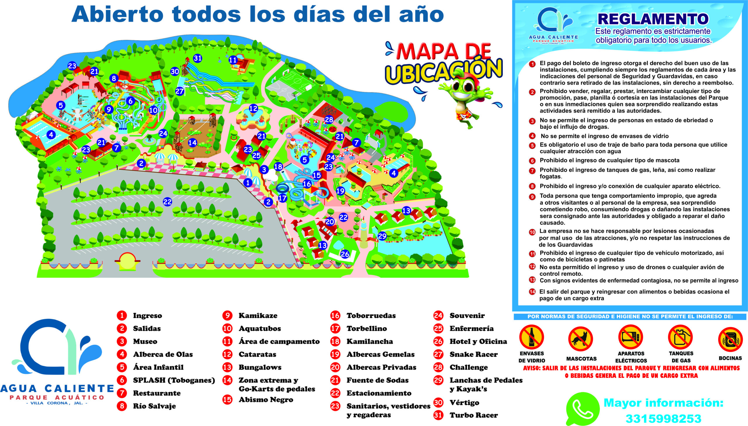 El uso de todos los toboganes, las albercas de olas, el Kamilancha incluyendo llantas y áreas de juegos infantiles. Las atracciones en funcionamiento pueden variar dependiendo la temporada. Para mayor información puedes comunicarte a nuestras oficinas. Nuestros horarios de servicio son de lunes a viernes de 8:00 AM a 5:00 PM. Sábados, domingos, semana santa, pascua y diías festivos de 8:00 AM a 6:00 PM.